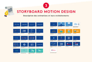 Cette étape consiste à créer un script des différentes animations et leurs enchaînements. L’objectif est de valider le déroulement de la vidéo entière, pour ensuite pouvoir commencer l’animation. En parallèle, il faut valider la durée approximative de la vidéo, et surtout la musique de fond. C’est cette musique qui va rythmer les animations et définir leur vitesse. Il est important de la valider en amont pour ne pas avoir à modifier le rythme de la vidéo une fois que toutes les animations sont créées et calées.
