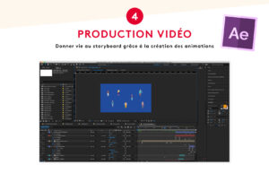 Nous pouvons désormais ouvrir After Effect et commencer ! Nous donnons du mouvement aux textes et illustrations, et créons les transitions pour donner de la fluidité dans les enchaînements d’apparition des chiffres. Toute la vidéo est créée en séquences qui sont assemblées bout à bout.